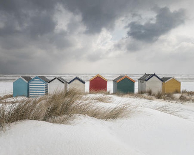 A praia coberta de neve em Southwold com as típicas cabanas de banho inglesas. Foto: Lee Acaster.
