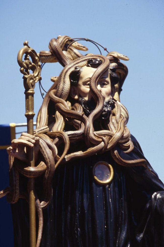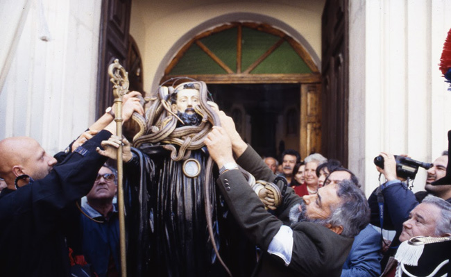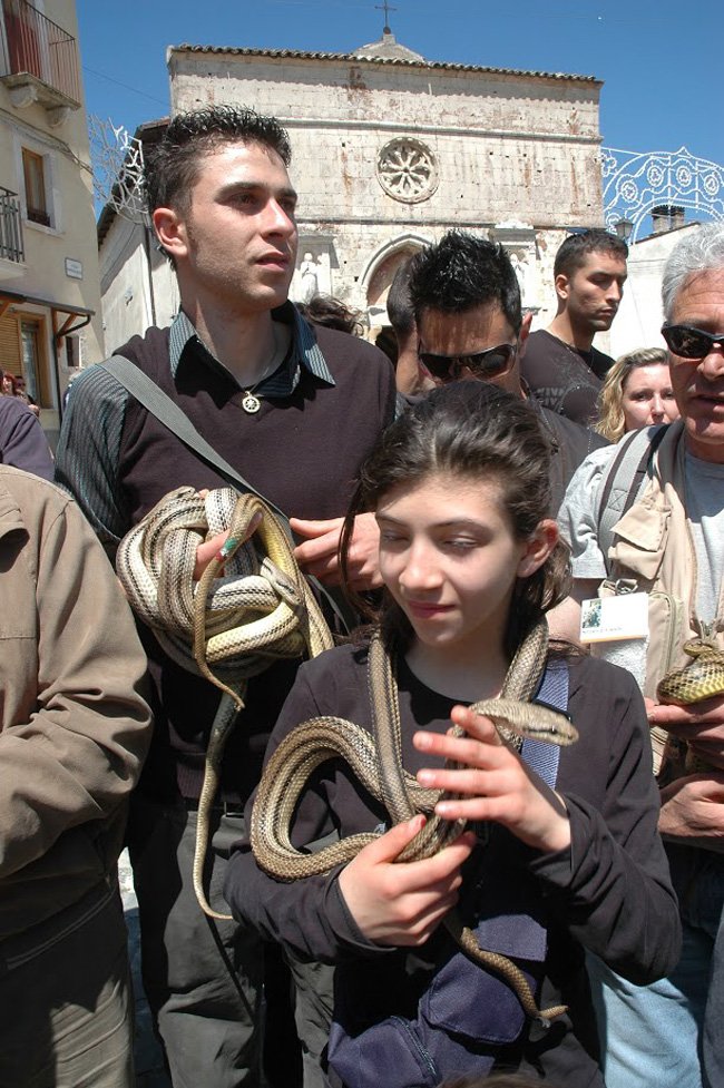 Em Cocullo, nos Abruzos, todos os anos na primeira semana de maio a imagem de São Domenico é coberta por serpentes vivas. O rito hoje é católico, mas tem origens pré-cristãs.