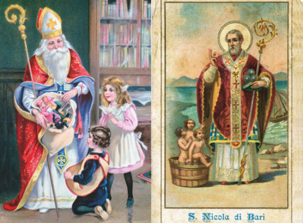 À esquerda, São Nicolau carrega presentes de Natal em um cartão alemão de 1939. À direita, uma imagem do santo com os três meninos que foram salvos da barrica de salmoura e a bola de ouro que simboliza o dote que o santo ofereceu às três mocinhas pobres.