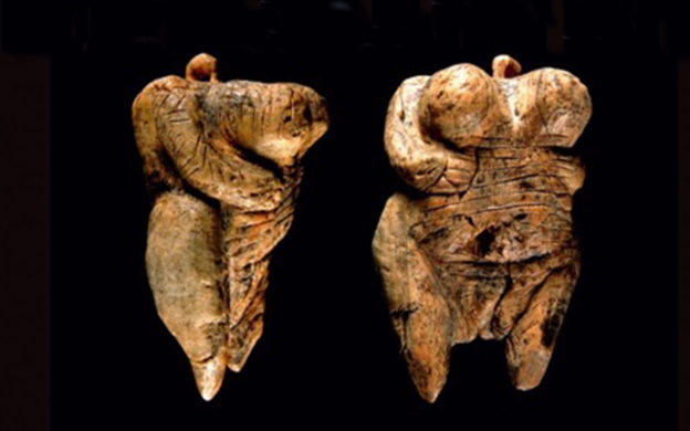 A primeira escultura de forma humana que se conhece foi realizada há 35 mil anos. Trata-se de um pendant de marfim de mamute, longo apenas 6 centímetros, encontrado na gruta de Hohle Fels, na Alemanha. Descoberta em 2008, a estatueta representa uma mulher gorda, com seios enormes, nádegas grandes e uma vulva muito acentuada. Trata-se, com toda probabilidade, de uma divindade feminina, para ser levada ao pescoço.