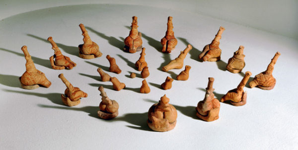 Estatuetas do 5o milênio antes de Cristo, encontradas em Poduri, na atual Romênia: trata-se de uma assembleia de deusas e reproduz a vida real nas aldeias matriarcais.