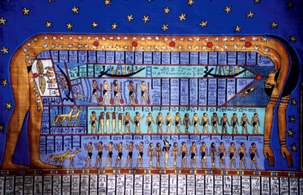 A deusa egípcia Nut se alonga para formar a abóboda celeste. Ela era a Senhora do Céu, do Dia e da Noite, e do Renascimento.