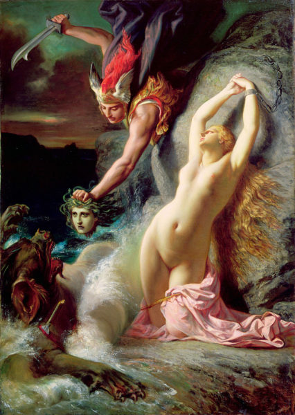 Medusa era a única mortal das três monstruosas irmãs chamadas Górgonas. Mas a imagem inicial de Medusa (em grego “aquela que domina”), era a de uma mulher belíssima. O deus Poseidon se apaixonou por ela e a seduziu. Por causa disso, a deusa Atena a puniu transformando-a em um monstro com serpentes no lugar dos cabelos. Além disso, quem visse o rosto de Medusa era imediatamente transformado em pedra. O mito narra que, com o ânimo atiçado pelo rei da ilha de Serifo, Polidete, o jovem herói Perseu prometeu que traria para o rei a cabeça de Medusa. Perseu foi ajudado pelos deuses Atena e Hermes, que deram a ele um escudo reluzente e uma foice. Usando o escudo para não ter de fita-la diretamente, Perseu conseguiu cortar a cabeça da Górgona. Na visão do historiador Johann J. Bachofen, seres femininos monstruosos como a Medusa (“aquela que domina”) ou a Esfinge representavam o medo que os homens têm do sexo feminino. Os gregos, de modo mais pragmático, reviviam com tais mitos as antigas vitórias alcançadas contra as grandes matriarcas da antiguidade.