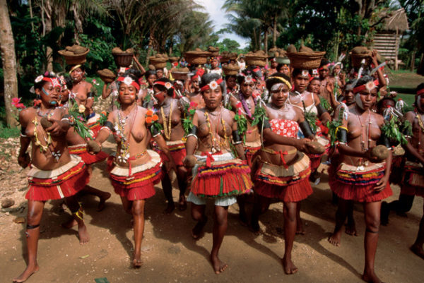 Mulheres trobriandesas durante a grande festa do inhame desfilam levando nas mãos alguns desses tubérculos recém recolhidos.