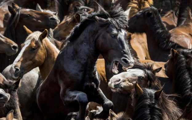 8 Rapa das Bestas – Finalista Categoria Natura. A Rapa das Bestas é uma festa que se celebra todos os anos em várias cidades da Galícia (Espanha), particularmente em Sabucedo. É uma espécie de rodeio: os participants devem conseguir domar uma manada de cavalos selvagens, levando-os da montanha até os currais, recintos no interior da cidade. Foto: Javier Arcenillas