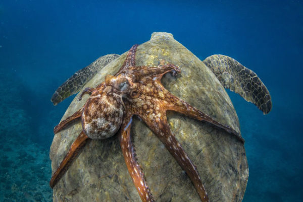 1. Carona – Finalista na Categoria Natureza . Um polvo vai na garupa de uma tartaruga marinha. Foto: Michael B. Hardie