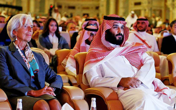 O príncipe Mohammed bin Salman, herdeiro do trono saudita e principal patrocinador do Future Investment, participa de forum em Ryiad ao lado de Christine Lagarde, diretora do Fundo Monetário Internacional