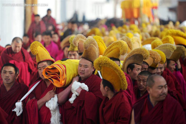 Desfile de dignitários budistas acompanham o cortejo no ritual do Buda ao Sol