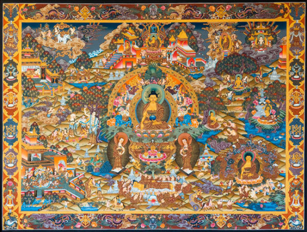 Thangka retratando episódios da vida de Buda.