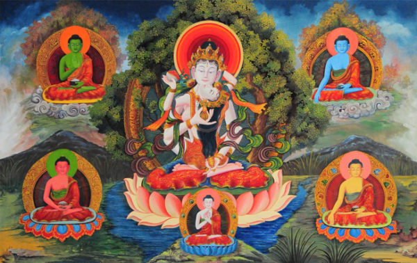 As divindades mostradas nas pinturas thangka são apresentadas, quase sempre, como reproduções pictóricas de visões que apareceram para grandes mestres espirituais budistas no momento da sua realização. Tais visões são gravadas e a seguir incorporadas nas escrituras budistas.