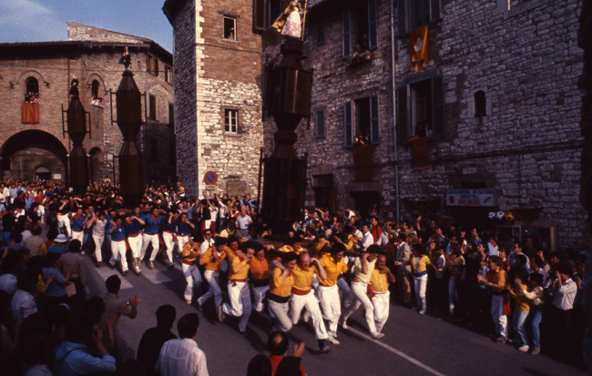 Também em Gubbio, na Itália central, enormes peças de madeira são carregadas por braços masculinos pelas ruas da cidade. São os “ceri”, originários da Idade Média.