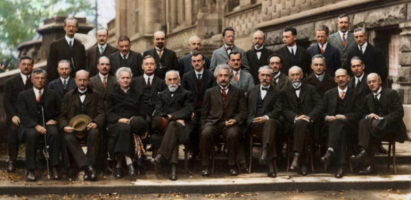 29 pessoas (uma única mulher, Marie Curie). 17 delas eram ou se tornariam prêmios Nobel, de física ou de química. São os participantes da 5a Conferência de Solvay, em abril de 2027, em Bruxelas, dedicada oficialmente a elétrons e a prótons, mas que na verdade foi palco do primeiro grande debate sobre física quântica, colocando em confronto os que apoiavam a interpretação da mecânica quântica segundo a escola de Copenhague e um grupo de céticos que não acreditava na sua natureza intrinsicamente probabilística. Os primeiros tinham como líder Bohr, e os segundos eram representados por Einstein.