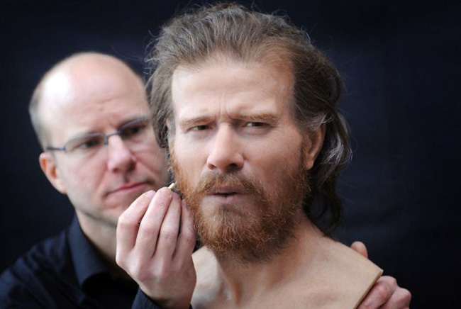 A face deste homem foi reconstruída a partir da análise de seu esqueleto de 5.500 anos atrás. Ele tinha entre 25 e 40 anos e era esbelto. À esquerda, o arqueólogo Nilsson retoca sua obra.