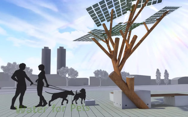 Árvore eletrônica. Sombra, água fresca, recarga de celulares e wi-fi grátis