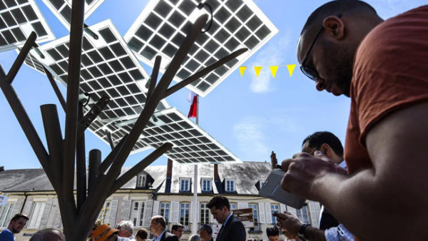 A eTree instalada em Nevers, na França: desenho inspirado na acácia e recursos para acolher todos os que não podem ficar desplugados (Foto: Philippe Desmazes / AFP)