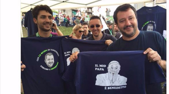Matteo Salvini (direita), atual ministro da Administração Interna da Itália e líder do partido de extrema-direita Liga, em 2016, mostrando uma Tshirt que diz “O meu papa é Bento”