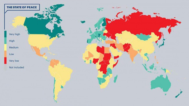 O mapa interativo elaborado pela organização Visions of Humanity, uma iniciativa do Institute for Economics and Peace, inclui 163 países (99,7% da população mundial, com a Palestina que aparece pela primeira vez na lista) ordenados com base em 23 critérios tais como o impacto do terrorismo, percepção da criminalidade, instabilidade política, guerras, despesas militares. Disso surge uma pontuação, a “State of Peace” em uma escala que vai de 1 a 5, desde “muito alto” a “muito baixo” (ou seja, de muito seguro a nada seguro).