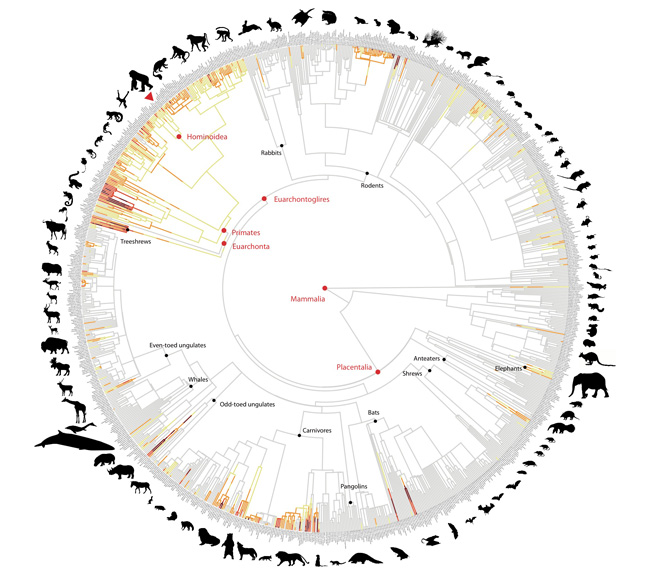 A evolução das agressões letais nos mamíferos: alguns grupos (vermelho) são mais violentos que outros, de cor amarela ou mais clara. A posição do homem entre os primatas é assinalada com um pequeno triângulo vermelho (mais ou menos no local das “onze horas”).