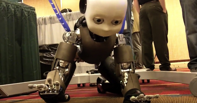 CB2, um robô infantil, construído por Minoru Asada, Japão, que queria compreender como os robôs aprendem.. Aqui, o CB2 está aprendendo a engatinhar.
