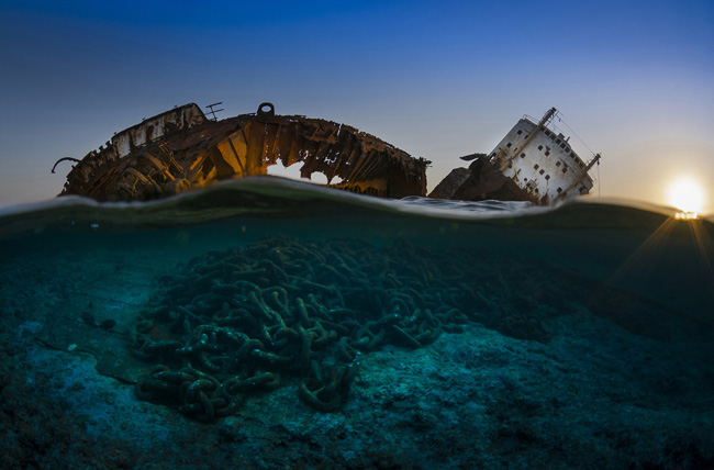 Os destroços do cargueiro Louilla, no Estreito de Tiran, nos limites do deserto do Sinai. Foi foto vencedora na categoria destroços. A âncora e a corrente ainda repousam sobre o fundo oceânico e parecem desenhar o perfil de uma baleia. Foto: Csaba Tokolyi.