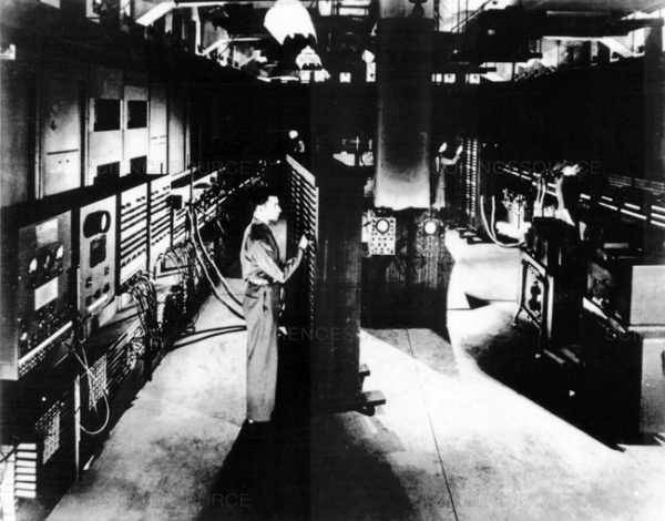 O ENIAC (Electronic Numerical Integrator and Computer), o primeiro computador eletrônico digital programável, construído em 1946, logo após a Segunda Guerra Mundial.