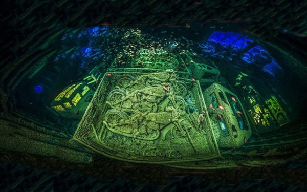 O conteúdo de um destroço militar inglês da Segunda Guerra Mundialo. Trata-se da nave SS Thistlegorm (afundada em Sharm El Sheikh, no Mar Vermelho, Egito) vista do alto, numa espetacular vista panoprâmica. A foto obtida a partir da justaposição de várias outras, valeu ao alemão Tobias Friedrich o título de vencedor absoluto do concurso. Sobre o convés da embarcação ainda podem ser vistas três motocicletas Norton 16H, com alguns peixes que nadam sobre elas. Foto: Tobias Friedrich, 2018.